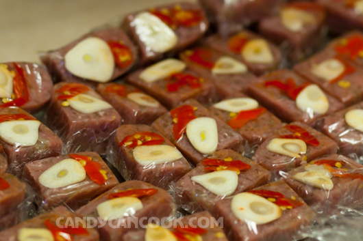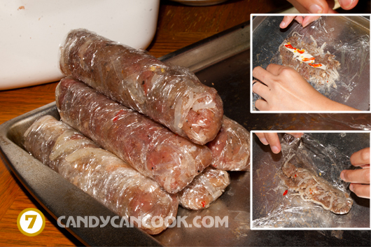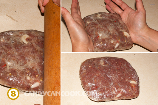 - Cách 2: cho tất cả chỗ thịt và dùng một miếng giấy plastic wrap to để gói lại thành hình vuông hay chữ nhật tùy cả nhà (giống trong hình). Sau đó dùng cây cán bánh cán qua cán lại cho miếng nem chua cứng lại. Càng cán, cả nhà sẽ thấy thịt hồng trở lại đấy :D. Sau đó mở miếng giấy ra, xếp tỏi, ớt lên một mặt của miếng thịt rồi gói lại và để nguyên. Khi nào ăn thì cắt ra thôi :D … Còn muốn cầu kì thì cả nhà cắt thành từng miếng nhỏ, rồi lại gói mỗi miếng đó với 1 miếng ớt, một miếng tỏi :D Làm cái này hơi mệt nhưng trình bày đẹp và khi nào có party thì đỡ tranh nhau hehe … Hôm nọ tớ gói 60 cái nhỏ mà mất 2 tiếng đấy :-s
