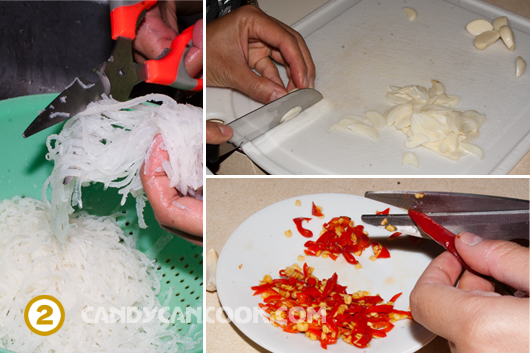 - Ớt lấy kéo cắt lọc bỏ cái lõi và hạt để riêng ra, cắt những miếng đẹp để trình bày, còn lõi, hạt và những miếng nhỏ thì để lát trộn vào với thịt. Ớt này thì tùy thuộc vào trình độ ăn cay của mỗi người mà cả nhà điều chỉnh nhé. Muốn ăn cay nhiều thì trộn ớt băm nhiều vào thịt, còn ăn cay ít thì gói ngoài để nếu lỡ có cay quá có thể bỏ ra được cả nhà nhé.