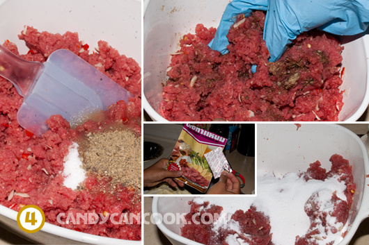 - Cho gói nhỏ đó vào rồi trộn lên sẽ thấy thịt tái xám đi, rồi bắt cứng lại… Lần đầu làm tớ hơi hoảng vì không hiểu là do có vấn đề gì không và không biết liệu thịt có hồng trở lại như nem chua bình thường hay như thế nào. Tới bước này cả nhà phải trộn nhanh tay hơn và đặc biệt là thịt bắt đầu đông nên sẽ phải dùng lực nhiều một chút đấy :D Thịt tái là hoàn toàn bình thường nhé cả nhà ;) Tớ đồ là đây chính là phản ứng hóa học gì đó của loại muối trong gói nhỏ sẽ làm thịt chín. Hơ, như vậy thì nem chua đâu phải là thịt sống nhể ^^ …